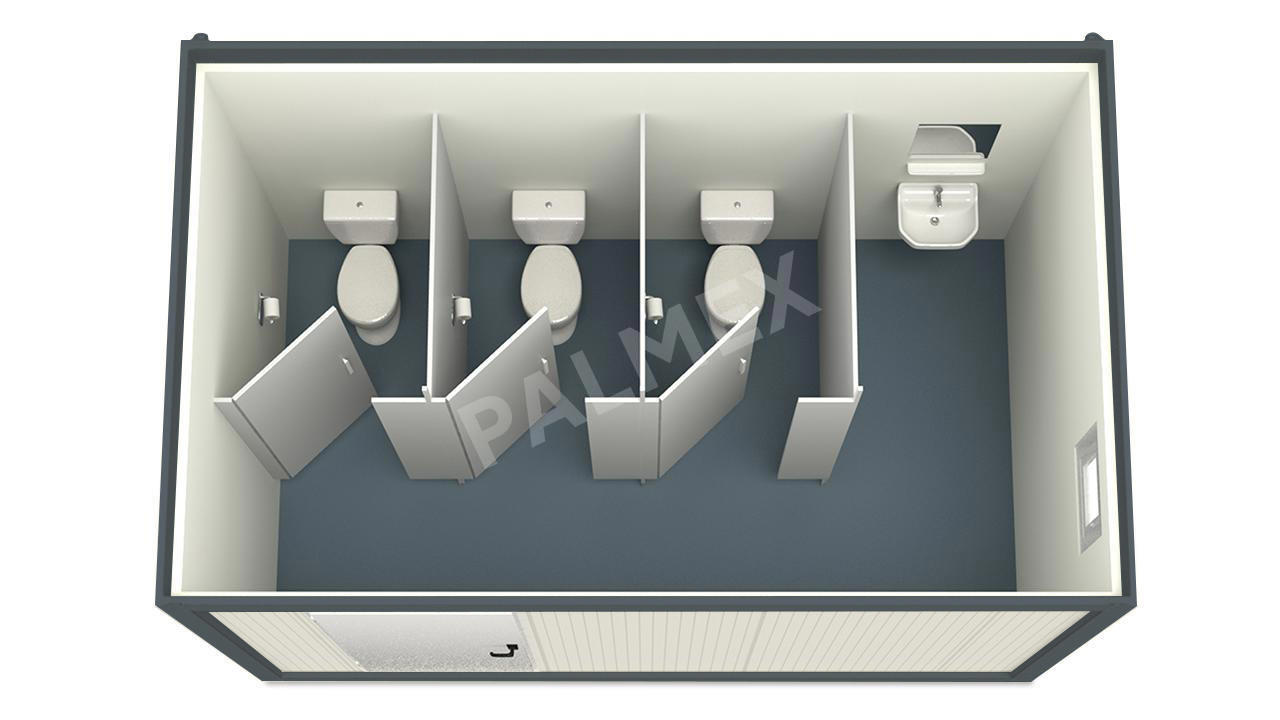 Acest Container Sanitar 4m HI-FLEX cu 3 WC echipat complet, din structura metalica si panouri sandwich este o solutie moderna si practica pentru asigurarea igienei in zonele in care nu exista facilitati sanitare permanente. Realizat din materiale rezistente la conditiile meteorologice extreme sau temperaturile ridicate sau scazute, este prevazut cu izolatie termica si fonica pentru a asigura confortul utilizatorilor.